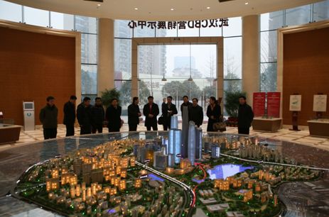 1月12日上午,中国国际贸易协会副会长、国际品牌管理中心主任许京等一行四人参观考察武汉CBD。市委副秘书长袁堃、江汉区委书记李强,以及商务区管委会相关部门领导陪同客人参观。在营销展示中心,来宾听取了公司行政总监林建勇关于武汉CBD的总体规划介绍,并观看了武汉CBD宣传片。许京副会长与市、区领导还就开发营运武汉CBD进行了座谈交流。