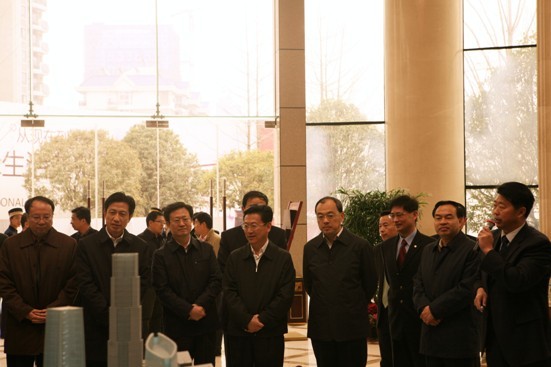 杨松副书记一行在公司营销展示中心观摩了CBD模型,听取了王家墩商务区管委会工委委员孟炜同志关于武汉CBD整体规划情况的介绍;现场视察了泛海城市广场一期施工进展,听取了公司总裁吴道缘关于泛海建设集团投资建设武汉CBD各项目工程进度的简要汇报。杨松副书记高度关注武汉CBD地下空间建设情况,认为规模宏大和功能完善的地下空间是武汉CBD有别于国内外CBD的重要亮点之一。市委书记阮成发对武汉CBD各项目开发建设工作全面展开的良好局面给予了充分肯定,同时希望武汉CBD各投资和开发单位加快建设进度,严格按照武汉市委、市政府要求,力争“十二五”期间初步建成武汉CBD,为湖北武汉跨越式发展发挥应有的作用。视察中,唐良智市长十分关心商务区建设进度,在听取商务区管委会主任张平和公司总裁吴道缘汇报时,表示市相关部门将全力支持商务区建设。