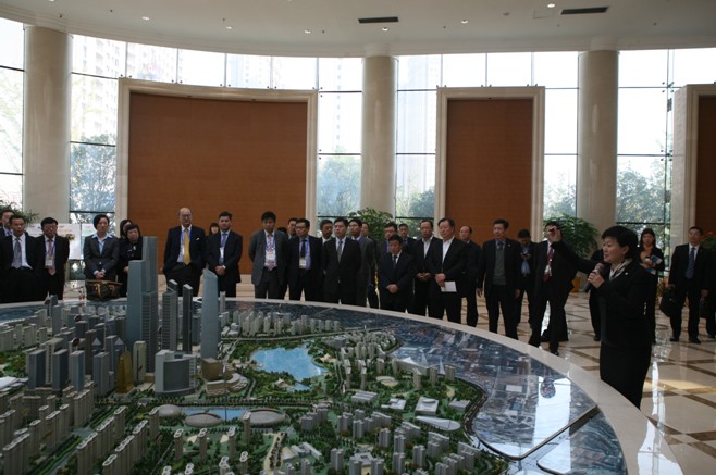 代表团在营销展示中心参观了武汉CBD规划模型,副总裁王军代表公司向代表团介绍了武汉CBD的总体规划、建设进展以及包括银行业在内相关产业的引入情况。